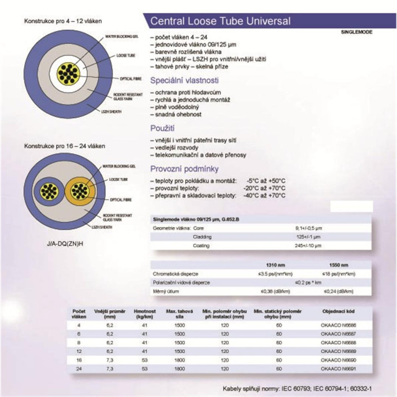 Kabel gelový UNIV 09/125um, 8vl., LSOH,CLT se základní ochranou proti hlodavcům Obchodní informace: Cena uvedena za 1m, do objednávky vložte počet udávající délku v metrech. Specifikace • počet vláken 8 • jednovidové vlákno 09/125 µm • barevně rozlišená vlákna • vnější plášť • LSZH pro vnitřní/vnější užití • tahové prvky • skelná příze Speciální vlastnosti • ochrana proti hlodavcům • rychlá a jednoduchá montáž • plně voděodolný • snadná ohebnost Použití • vnější i vnitřní páteřní trasy sítí • vedlejší rozvody • telekomunikační a datové přenosy Provozní podmínky • teploty pro pokládku a montáž: -5°C až +40°C- • provozní teploty: -30°C až +70°C • přepravní a skladovací teploty: -40°C až +70°C
