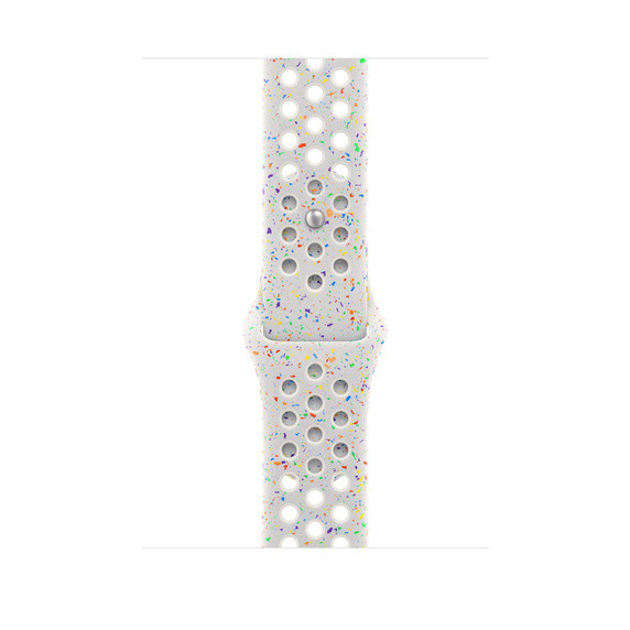 45mm platinový sportovní řemínek Nike – M/L Tenhle sportovní řemínek Nike má vylisované otvory pro větší vzdušnost, je odolný, pevný a přitom krásně poddajný. Obsahuje barevné vločky vytvářející náhodné vzory, takže každý řemínek je originál. Jeho hladký, hutný materiál se elegantně ovine kolem zápěstí a příjemně sedí. A nově se zapíná na hliníkový kolíček s matným povrchem. Řemínek obsahuje minimálně 32 % recyklovaného fluoroelastomeru, přičemž obsah recyklovaného fluoroelastomeru v každé vločce je minimálně 66 %.