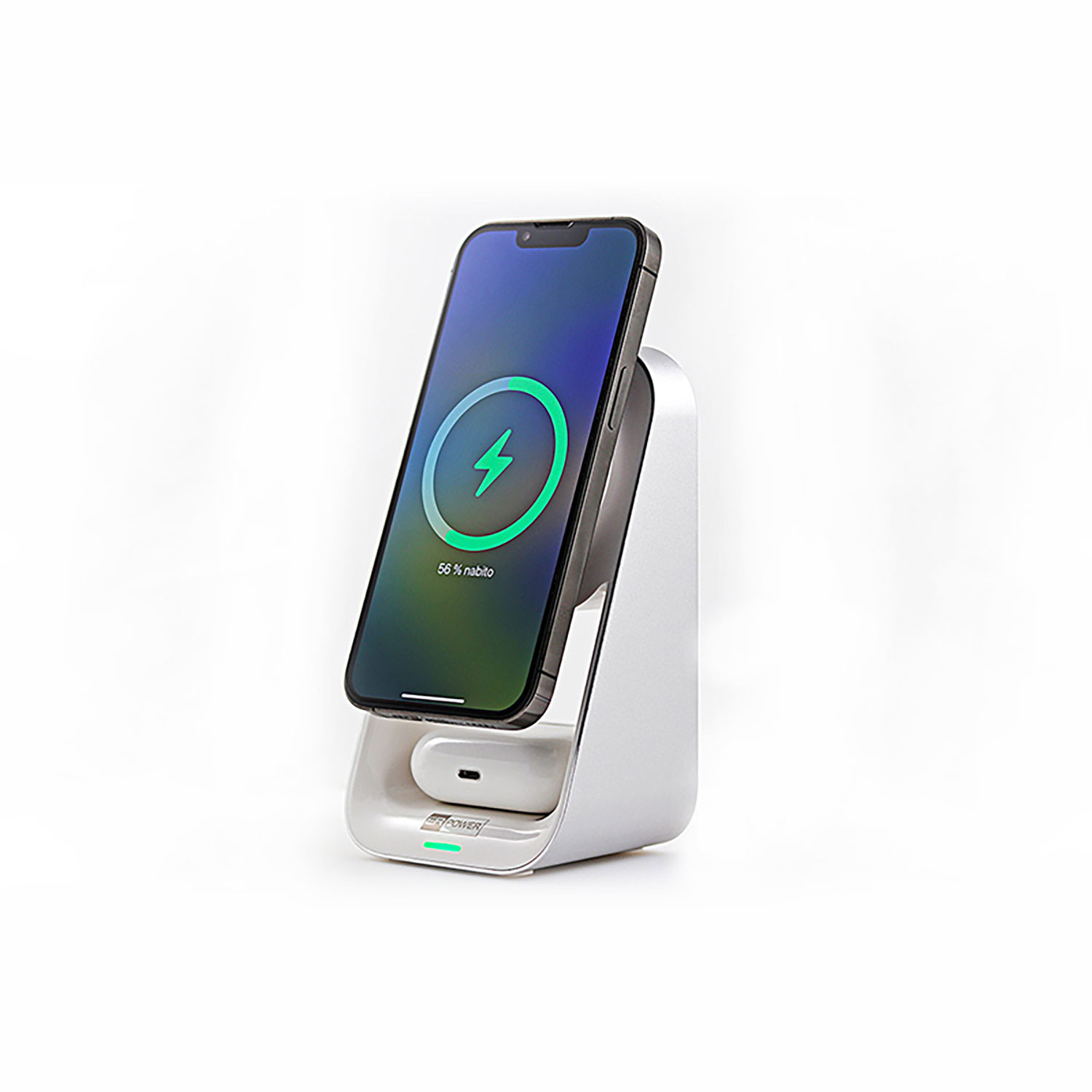 Hliníkový nabíjecí stojan s MagSafe s výkonem až 15W. Součástí balení je GaN adaptér s výkonem 33W a USB-C/USB-C kabel v délce 2 metry. Smartphone můžete nabíjet jak vertikálně, tak horizontálně, iPhone 12 a novější výkonem až 15W Produkt je kompatibilní s MagSafe pouzdry. Vybaven LED světlem, které indikuje stav nabíjení sluchátek. Barva: bílá