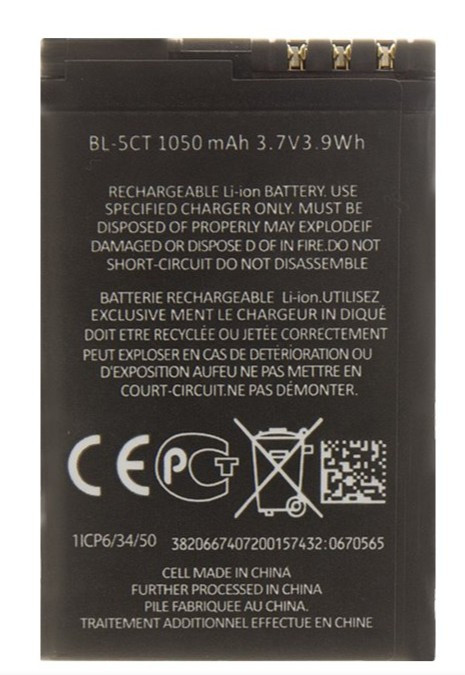 BL-5CT Baterie pro Nokia 1050mAh Li-Ion (OEM) Nokia 3720c, 5220 XM, 6303c, 6303c Illuvial, 6730c, C3-01Touch and Type, C5, C6-01. Nejedná se o originální baterii.