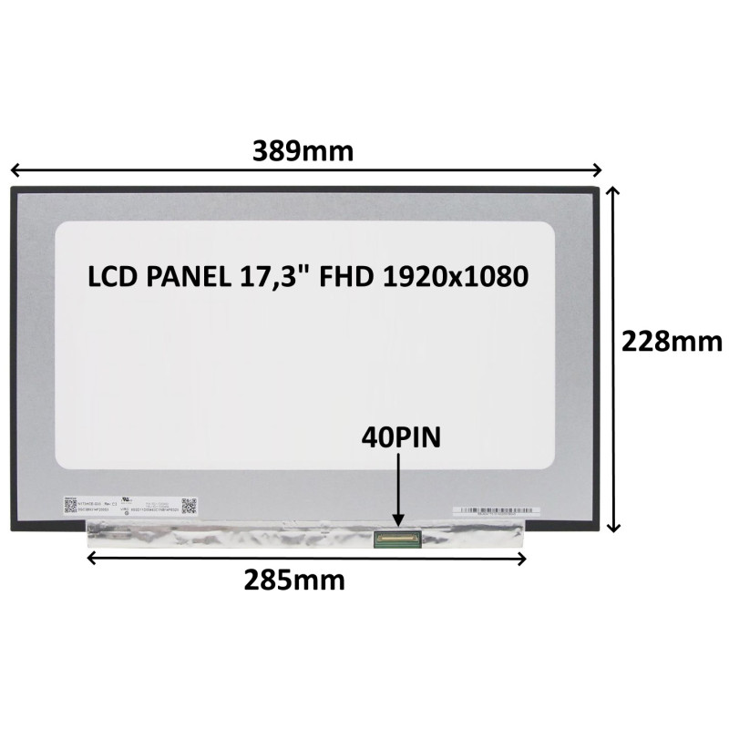 Úhlopříčka: 17,3'' Rozlišení: 1920x1080 FHD Konektor: 40 PIN Typ podsvícení: LED Povrch LCD panelu: MATNÝ Technologie LCD panelu: IPS Rozměry: Šířka: 389 mm Výška: 228 mm Délka invertoru: 285 mm Způsob uchycení LCD panelu: bez úchytů - lepení k LCD krytu Záruka: 24 měsíců i na vadné pixely