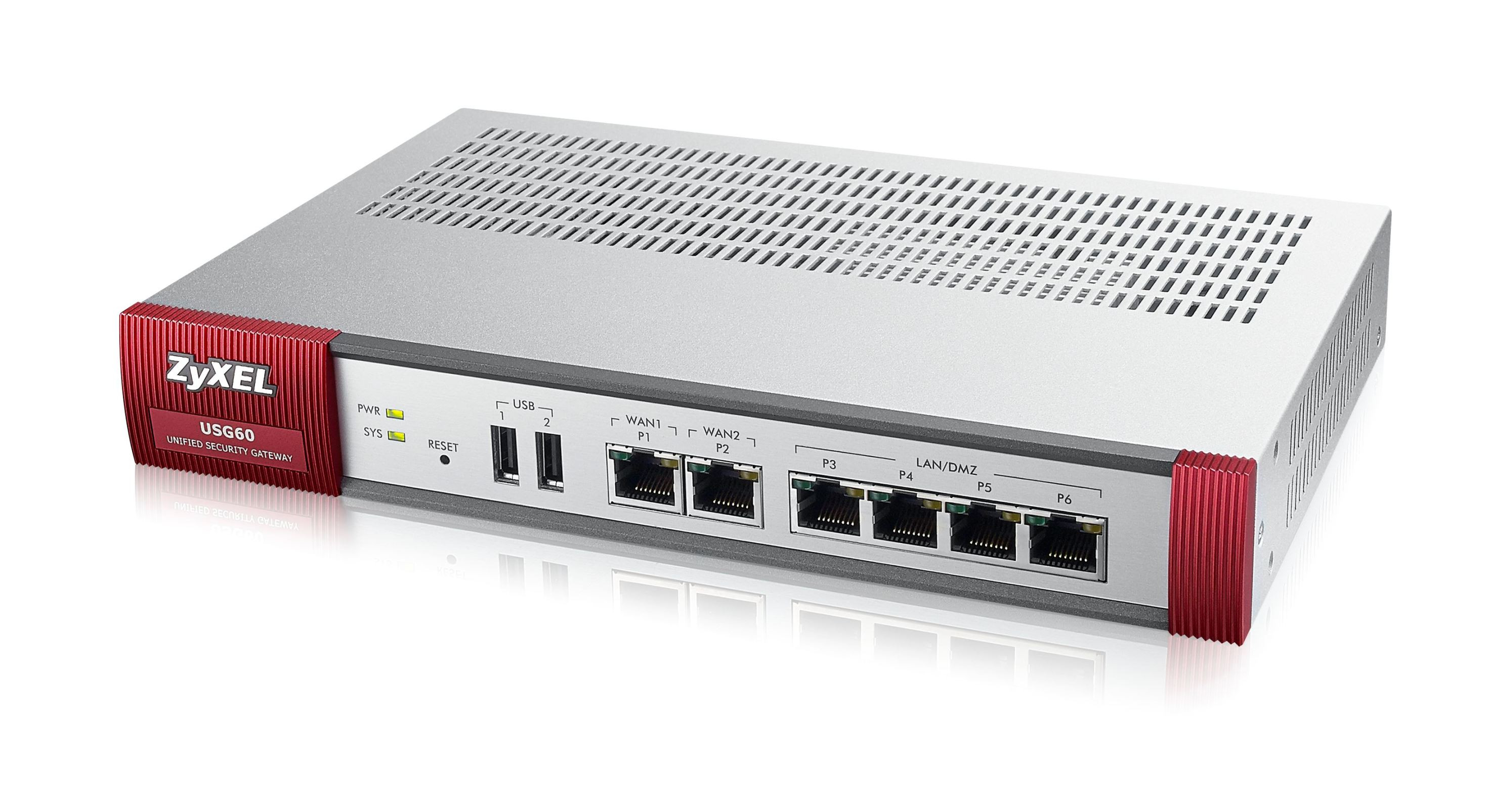 ZyXEL USG60 UTM BUNDLE OVERVIEW Security UTM solution: Firewall, VPN: 20x IPSec/ 20x SSL (5 default), 6x 1Gbps (4x LAN/DMZ, 2x WAN), 2x USB, Fanless, Wireless Controller for up to 18 (default 2) WAC6xxx/NWA3000-N/5000-N series of APs, included 1-year licenses of IDP, Antivir (Kaspersky), Antispam (Cyren), Content Filtering (Cyren), rack mounted SPECIFICATIONS HARDWARE SPECIFICATIONS 10/100/1000 Mbps RJ-45 ports • 4 x LAN/DMZ, 2 x WAN USB ports • 2 Console port • Yes (DB9) Rack-mountable • Yes SYSTEM CAPACITY & PERFORMANCE SPI firewall throughput (Mbps) • 1,000 VPN throughput (Mbps) • 180 IDP throughput (Mbps) • 120 AV throughput (Mbps) • 90 UTM throughput (AV and IDP) • 90 Unlimited user licenses • Yes Max. TCP concurrent sessions • 40,000 New TCP session rate • 3,000 Max. UTM (AV & IDP) concurrent sessions • 40,000 Max. concurrent IPsec VPN tunnels • 20 Max. concurrent SSL VPN users • 12 Included SSL VPN user no • 2 Customizable zones • Yes IPv6 support • Yes VLAN interface • 16 WLAN MANAGEMENT AP Controller (APC) ver • 1.0 Managed AP number (default/max.) • 2/10 KEY SOFTWARE FEATURES Virtual Private Network (VPN) • Yes (IPSec, SSL, L2TP over IPSec) Firewall • Yes Anti-Virus (AV) • Yes Anti-spam • Yes Content Filtering (CF) • Yes Application intelligence and optimization • Yes Intrusion Detection and Prevention (IDP) • Yes Single Sign-On (SSO) • Yes POWER REQUIREMENTS Power input • 12 V DC, 3.0 A max. Max. power consumption (watt) • 19.0 OTHERS MTBF (hr) • 815,463.9 PHYSICAL SPECIFICATIONS Item dimensions (WxDxH) • 242 x 175 x 36 mm Item weight • 1.25 kg