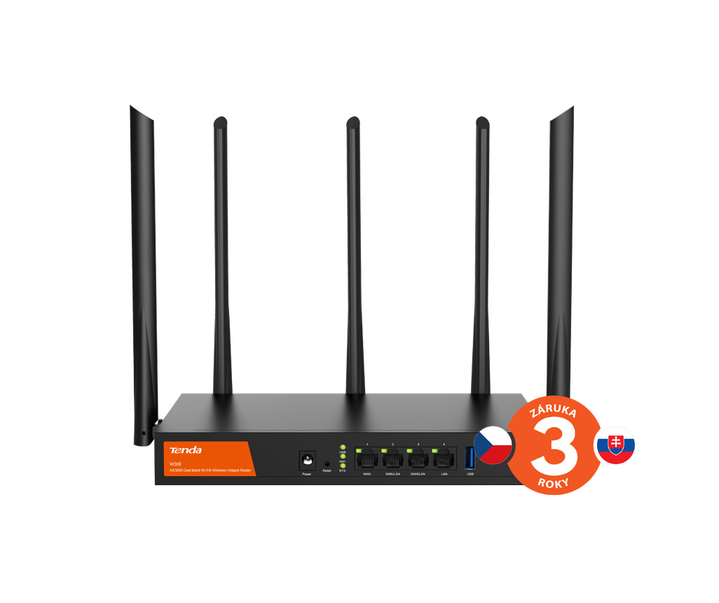 AX3000 Dual-Band Wi-Fi Load Balance Hotspot router 802.11 ax/ac/a/b/g/n, až 2976 Mb/s, 1x GWAN, 2x GWAN/GLAN, 1x GLAN, 5x anténa 6 dBi. (2,4GHz 574Mbps + 5GHz 2402Mbps), Captive portal, VPN Server / Client, Multi WAN balance, kontrolér pro AP Tenda, DDos + ARP attack protection, DDNS. Součástí balení je český, slovenský, a polský manuál. Popis produktu Dvoupásmový bezdrátový WiFi Hotspot gigabitový router pracující souběžně v pásmu 2,4GHz (574 Mb/s) a 5GHz (2402 Mb/s), celková rychlost WiFi až 2976 Mb/s, standardy WiFi 802.11ax/ac/a/b/g/n, multi WAN balance 1x GWAN, 2x GWAN/GLAN, 1x GLAN, QoS, zabezpečení WPA3/WPA/WPA2-PSK, vlastní Captive portal (stránka pro vlastní přihlášení např. pro hotely), 5x anténa 6 dBi. Router umí spravovat Access Pointy Tenda i9, i21, i24, i25, i29 a další. VPN server/Client, WiFi pro návštěvy a mnoho dalších funkcí. Zabezpečení díky DDoS protection, ARP attack protection, DDNS a další. Tento router je ideálním řešením do kanceláří, hotelů, větších domů a dalších společností. Podpora až 3 x GWAN rozhraní pro sdílení konektivity více poskytovatelů Internetu nebo pro zálohu. Uživatel si může jednoduše vytvořit vlastní Captive portal pro přístup dle uživatelů a podporuje IPv6 a VPN server. Kovový obal, uchycení na stěnu. V kombinaci s velkým výběrem zabezpečení je ideálním WiFi routerem pro vaši práci i zábavu. Perfektní spolehlivost připojení díky 3x Gigabitovým WAN konektorům Díky třem gigabitovým WAN portům je možné připojit až 3 různé poskytovatele Internetu a využít tak maximální rychlosti a spolehlivosti připojení k Internetu. Router může zatížení konektivity Internetu buď rozložit do všech třech linek nebo vybrat hlavní a ostatní pak jako záložní. Router podporuje WiFi standardy 802.11 ax/ac/a/b/g/n a je tak univerzálním řešením vaší bezdrátové sítě. To vše s inteligentním řízením chipsetu, spotřeby, a kvality služeb tvoří opravdový ideál i pro náročnější prostředí. Porty umí pracovat různorodě jak uživatel potřebuje, v konfiguraci 1x GWAN, 2x GWAN / GLAN, 1x GLAN je nastavení opravdu individuální. WiFi kontrolér pro Tenda Access pointy Tenda W30E umí navíc spravovat další Access Pointy Tenda. Je možné tak do jedné sítě zapojit další Access Pointy Tenda i9, i21, i24, i25, i29 a další a centralizovaně je spravovat, nastavovat, aktualizovat apod. Podpora 2,4GHz a současně 5GHz Výhod využití obou pásem je hned několik. Ideální způsob rozdělení: - 2,4GHz: prohlížení webových stránek, stahování souborů, emaily apod. - 5GHz: hraní náročných Online her, HD / FullHD / 4K / 8K streamování videa, zvláště aplikace kde je důležitá latence. Pásmo 2,4GHz také bývá ve větších zástavbách nebo panelových domech velmi zarušené, a dochází tak k degradaci výkonu na nižší úroveň, tak se WiFi routery z okolí ruší navzájem. Při použití 5GHz vám tato starost zcela odpadá. Pokrytí signálem je zajištěno pomocí pěti 6 dBi antén. Součástí je nastavení síly signálu pro každou frekvenci zvlášť. QoS, SMART Bandwidth Control Samozřejmostí je také pokročilé QoS, díky kterému jsou upřednostněny v síti služby, které jsou náročné na zpoždění a latenci. Pokročilé QoS je navíc doplněno o novější funkci ''Smart Bandwidth Control'' díky které dochází opravdu k chytrému zatížení sítě pro co nejlepší zajištění veškerých služeb. Přístup do sítě díky Captive portálu Router podporuje základní nebo vlastní Captive portal. Velkou výhodou je že užvatel nemusí nic ''programovat''. Nastavení je jednoduché a hotové během několika minut. Kromě základního nastavení s logem Tenda a defaultním pozadí je možné nastavit: autentifikace (Kliknutím na potvrzovací tlačítko / Jméno + heslo / Email / Facebook). Dále se nastavuje čas jak dlouho má být uživatel přihlášen, pro kabelové i WiFi připojení zvlášť. Logo - nahrání vlastního loga do 30kB. Titulek - vlastní uvítací text. Obrázek na pozadí - vlastní obrázek 16:9 do 200kB. A navíc je možné nastavit webovou stránku která se má zobrazit po přihlášení. VPN Server / Port forwarding / DMZ Tenda W30E také vyniká plnou funkcí VPN Server. Podporuje PPTP server a L2TP server, dále PPTP Client, L2TP client a IPsec vše včetně kompletního nastavení. Navíc funkce Virtual Server, Port forwarding a DMZ díky kterým je možné nastavení dalších virtuálních portů apod. Zabezpečení, DDNS, Firewall W30E podporuje velké možnosti zabezpečení, nejnovější WPA3, WPA, WPA2, mixedWPA/WPA2 s PSK a šifrováním TKIP nebo AES. Router má možnost nastavení DDNS pro NoIP, DynDNS. Dále funkce filtrace zařízení v síti a Captive portal, Facebook authentication, IP / Mac / URL filter, IP-Mac binding, Any IP, ARP attack protection (ARP defense, ARP Broadcast Interval), DDoS protection (ICMP, UDP, SYN Flood threshold), IP attack protection (IP Timestamp, IP Security, IP Stream, IP Record route, IP Loose Source, Rouge IP option), Block WAN ping. Technické parametry Wi-Fi standardy: IEEE 802.11ax/ac/a/b/g/n 2,4 + 5GHz Frekvence: 2,4 GHz, 5 GHz Bezdrátové režimy: Wireless Router Přenosová rychlost: 5GHz: až 2402Mbps, 2.4GHz: až 574Mbps DHCP: DHCP Server, DHCP Client List, DHCP Reservation Základní funkce: SSID Broadcast: Enable/Disable Virtuální server: Port Forwarding, DMZ Host, UPnP Zabezpečení: WPA3-SAE, WPA-PSK, WPA2-PSK, Mixed WPA/WPA2-PSK, rodičovská kontrola Firewall a další: IP / MAC / URL filter, IP-Mac binding, ARP attack protection (ARP defense, ARP Broadcast Interval), DDoS protection (ICMP, UDP, SYN Flood threshold), IP attack protection (IP Timestamp, IP Security, IP Stream, IP Record route, IP Loose Source, Rouge IP option), Block WAN ping, Black/White List, MAC Clone, Stat