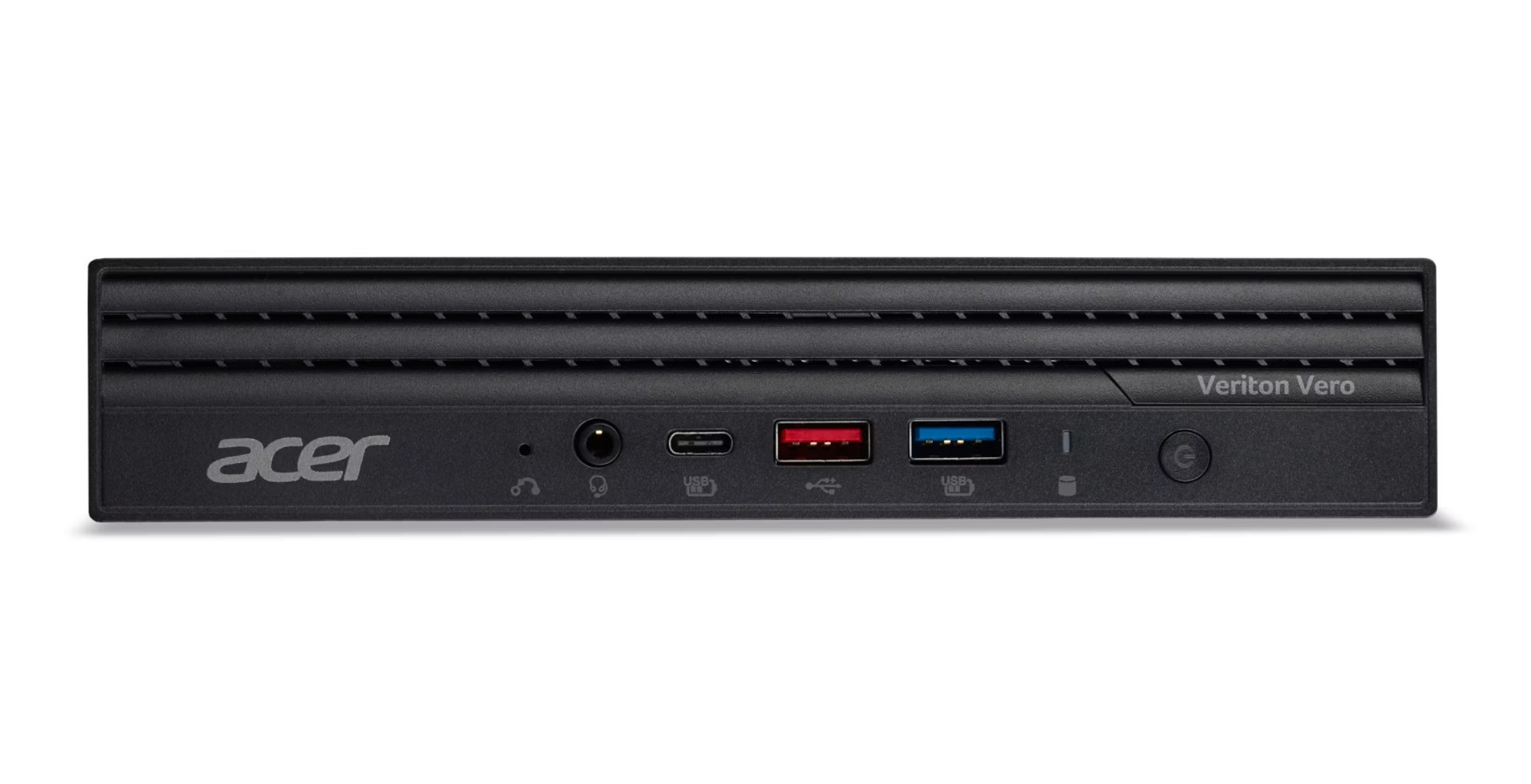 Acer Veriton Vero Mini N4720GT_W1_65W * VESA kit + ADP držák Operační systém: ne Procesor: Intel Core i5-14400T (10 jader - 6P + 4E, 16 vláken, P-core 1,5/4,5 GHz, E-core 1,1/3,2 GHz, 20 MB cache) Paměť: 8GB DDR5 Počet slotů (celkem/volných): 2 sloty DDR5 s podporou dvou kanálů (2/1) Pevný disk: 512 GB M.2 SSD Podpora úložiště: 1x M.2 + 1x 2,5'' Optická mechanika: ne Čtečka paměťových karet: ne Grafická karta: Integrovaná Intel UHD Graphics 730 Síť: GbE Bezdrátová komunikace: WiFi + Bluetooth Klávesnice: usb Myš: usb Správa zabezpečení: TPM v2.0 (Trusted Platform Module), bezpečnostní slot Kensington Napájení: externí 65W 3pin AC Přední porty: * 1x USB-C 3.2 Gen 2 (10 Gb/s) * 1x USB-A 3.2 Gen 2 (10 Gb/s) * 1x USB-A 3.2 Gen 1 (5 Gb/s) * 1x kombinovaný konektor pro sluchátka/mikrofon (3,5mm) Zadní porty: * 2x USB-A 3.2 Gen 1 (5 Gb/s) * 2x USB-A 2.0 (480 Mb/s) * 1x HDMI * 1x DisplayPort * 1x ethernet (RJ-45) * 1x bezpečnostní slot Kensington * 1x napájecí konektor Barva: černá Rozměry: 186,3x186,3x36,2mm