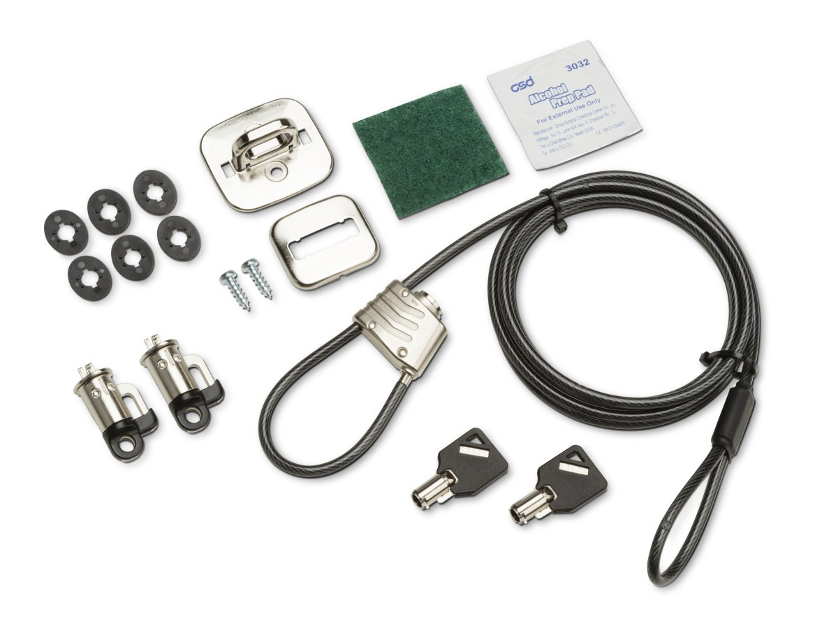 *Jednoduše protáhněte kabel otvorem pro zámek v počítači a monitorem, připevněte jej ke stolu nebo jinému ukotvenému povrchu a zamkněte jej svým klíčem. *Sada bezpečnostního zámku pro počítač HP Business v3 pomůže ochránit skříň počítače a monitor před neoprávněným přístupem či odcizením jak na pracovišti, tak na veřejných místech. Rozměry produktu (š x h x v): 32 x 50 x 29 cm Hmotnost produktu: 280 g Co je obsaženo v krabici *Bezpečnostní klíčový zámek *Kabel *Klíče *Bezpečnostní adaptér *Oddělovač *Základní deska s lepidlem *Šroub *Dokumentace